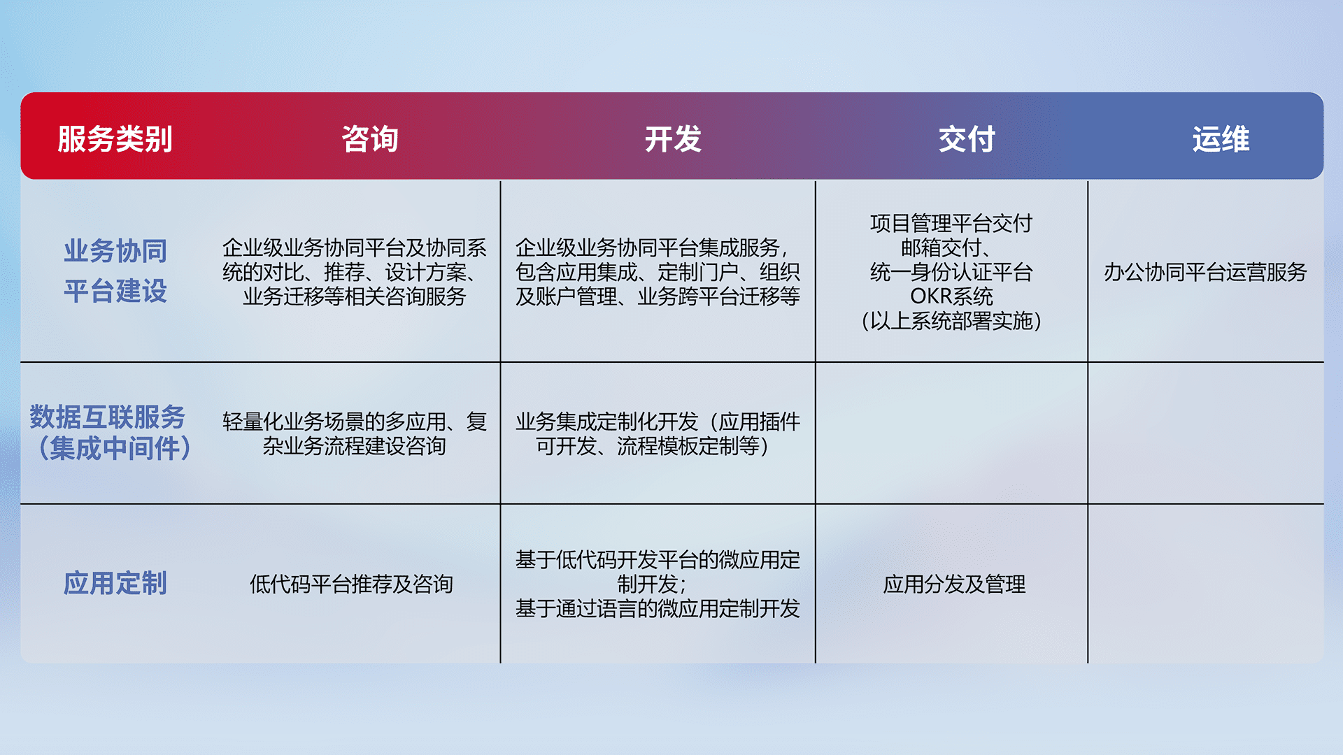 针对钉钉、、、、企微、、、、IDaas等平台级产品提供产品的规划、、方案、、交付、、、定制化开发等服务,,,,实现如统一协同办公、、、、智能客户服务、、、混合会议管理、、、智能数据查询、、等业务场景,,,实现数字化转型。。。